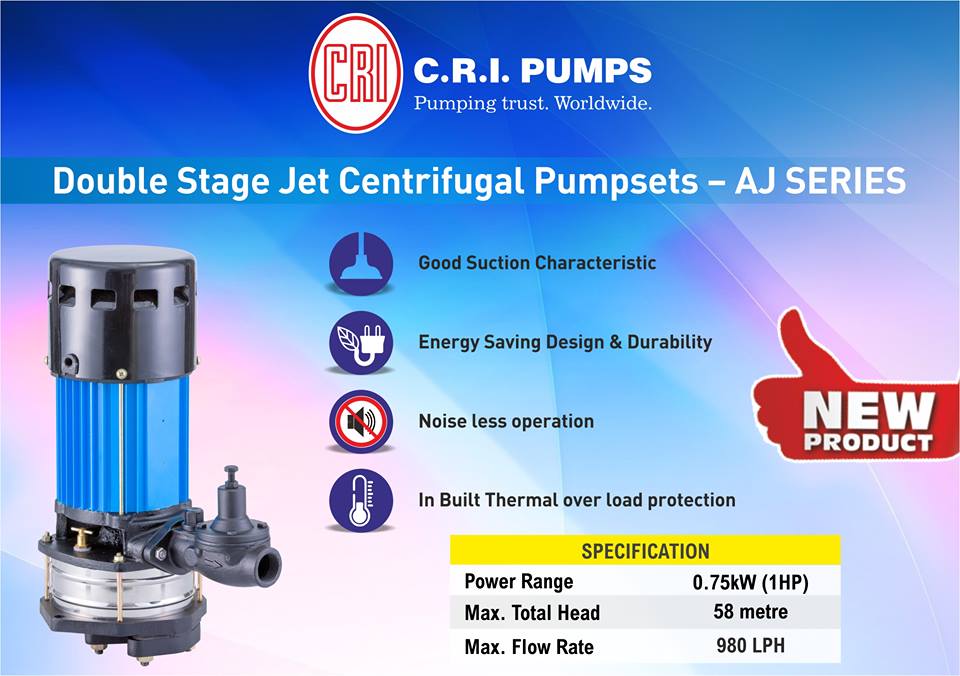 C.R.I. DOUBLE STAGE CENTRIFUGAL JET PUMPSET- AJ SERIES. Applications: Domestic water supply, gardens, farm houses, residential, civil applications the winding are of high grade enameled copper wire and varnish impregnated high performance and low temperature raise thereby increasing the life cycle of the motor C.R.I. DOUBLE STAGE CENTRIFUGAL JET PUMPSET- AJ SERIES. Applications: Domestic water supply, gardens, farm houses, residential, civil applications. We are the Leading CRI pumps in Jet pumps Dealer In Coimbatore, Tamil Nadu. CRI Pumps Dealer In Coimbatore. Leading CRI pumps In Coimbatore. No.1 CRI Pumps Jet pumps pumps Valves Dealer In Coimbatore.Dealer In . Best Quality CRI Pumps in Jet pumps pumps Dealer In Coimbatore. Low Price CRI Pumps Dealer In Coimbatore. Low-Cost Dealer In Coimbatore.